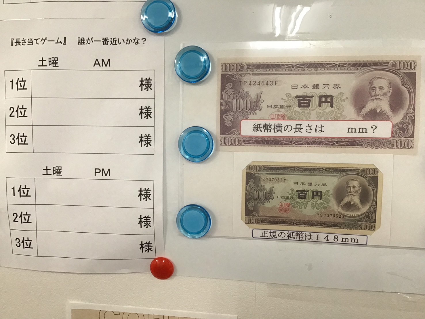 目指せ!ピッタリ賞。今週の目玉は「お札の長さ当てゲーム」!