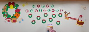 そして、皆様が作ってくださった小さなリースは、以前スタッフが心を込めて作った壁面飾りの周りに飾られ、